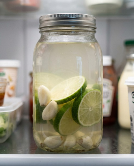 A large glass jar filled with peeled garlic cloves and fresh lime slices is quietly taking over kitchens.