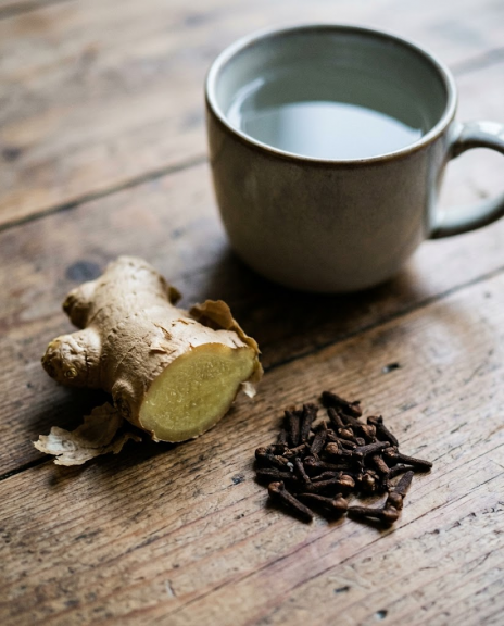 Fresh ginger, whole cloves, and a covered steep.