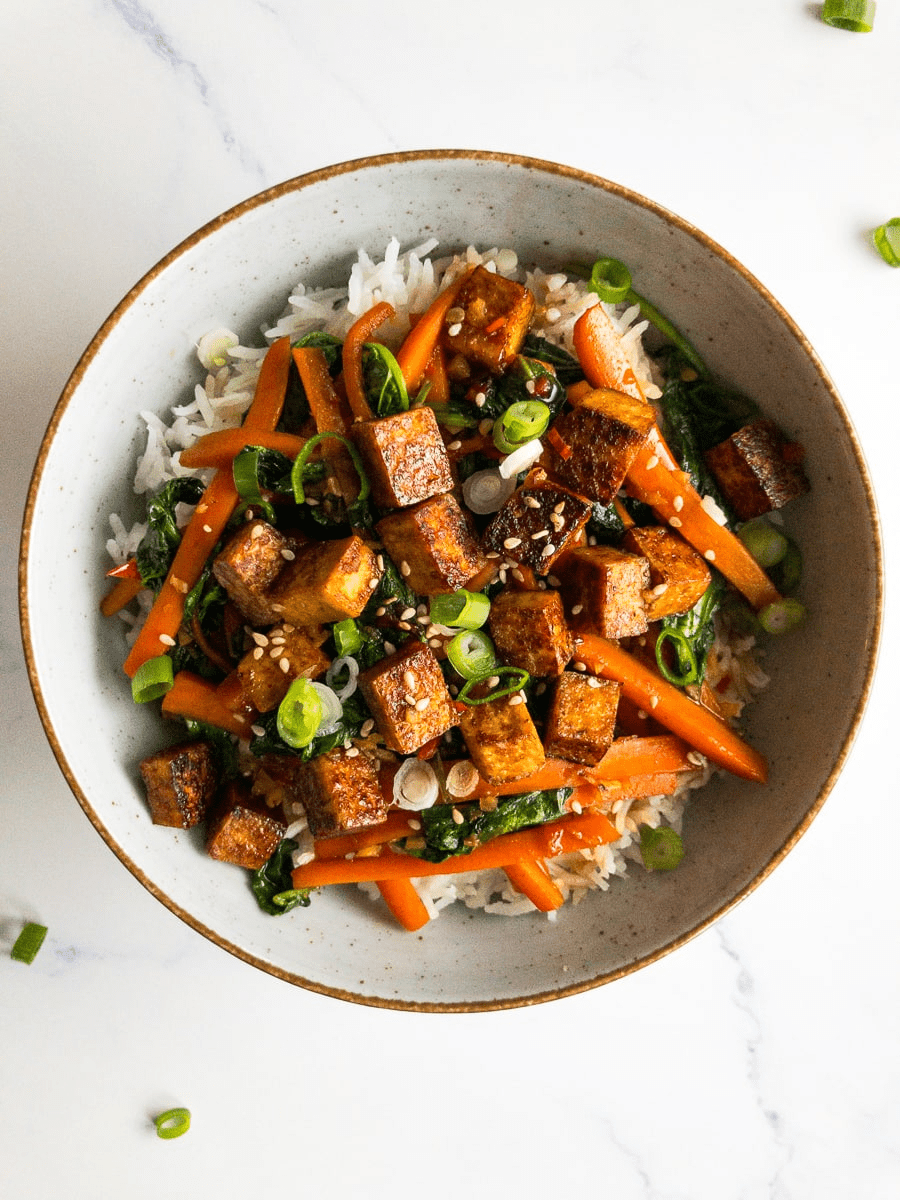 - 1 block (14 oz) firm tofu, cubed and pan-fried until golden