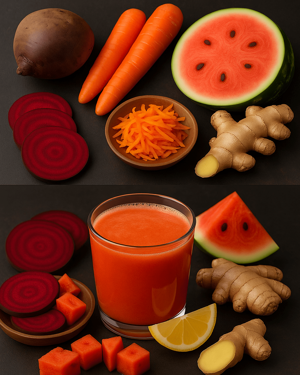 Watermelon, carrot, beetroot, and ginger may seem like an unusual mix at first, but each plays a unique role in creating a balanced, nutrient-rich drink.